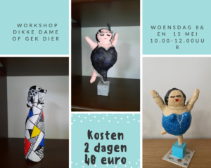 • 3 juli en 10 juli, Gek Dier of Dikke Dame maken, dier naar vrije keuze, wat mogelijk is, deze workshop wordt verdeeld over 2 avonden en de kosten zijn 40 euro, 1x maken en 1x beschilderen.